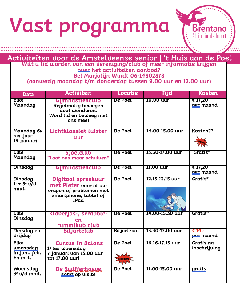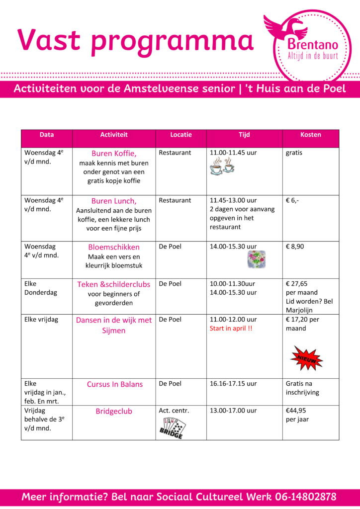 Bij ’t Huis aan de Poel worden verschillende activiteiten georganiseerd voor de wijkbewoners onder de thema’s Brentano Amuseert, Beweegt, Doet en Weet. Lees hieronder meer over de terugkerende wekelijkse activiteiten en de activiteiten per maand.