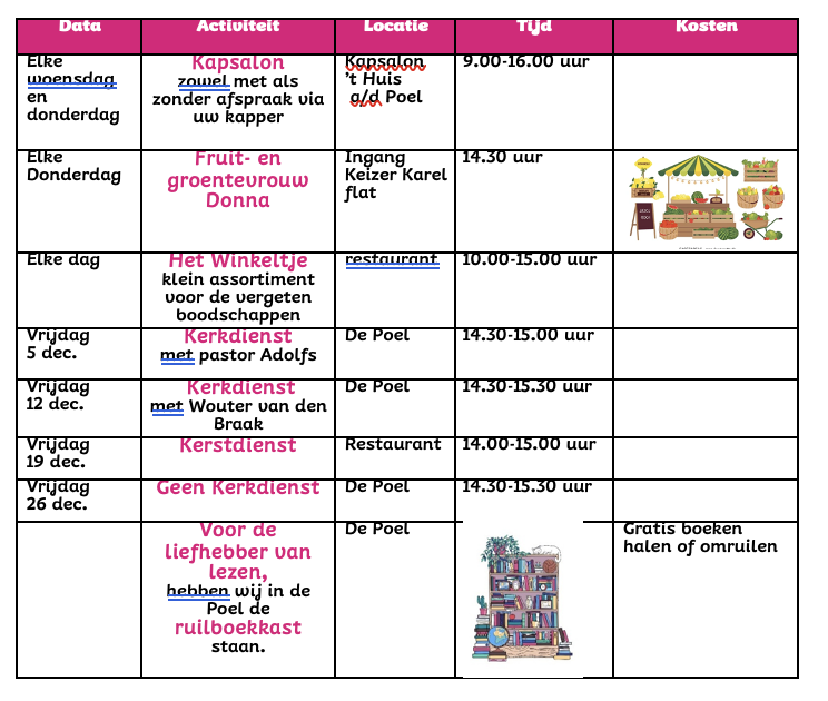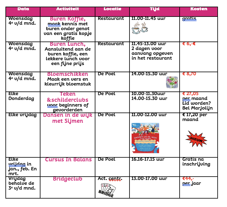 Hieronder de vaste activiteiten in de week. Voor wisselende activiteiten kijk in het maandprogramma.